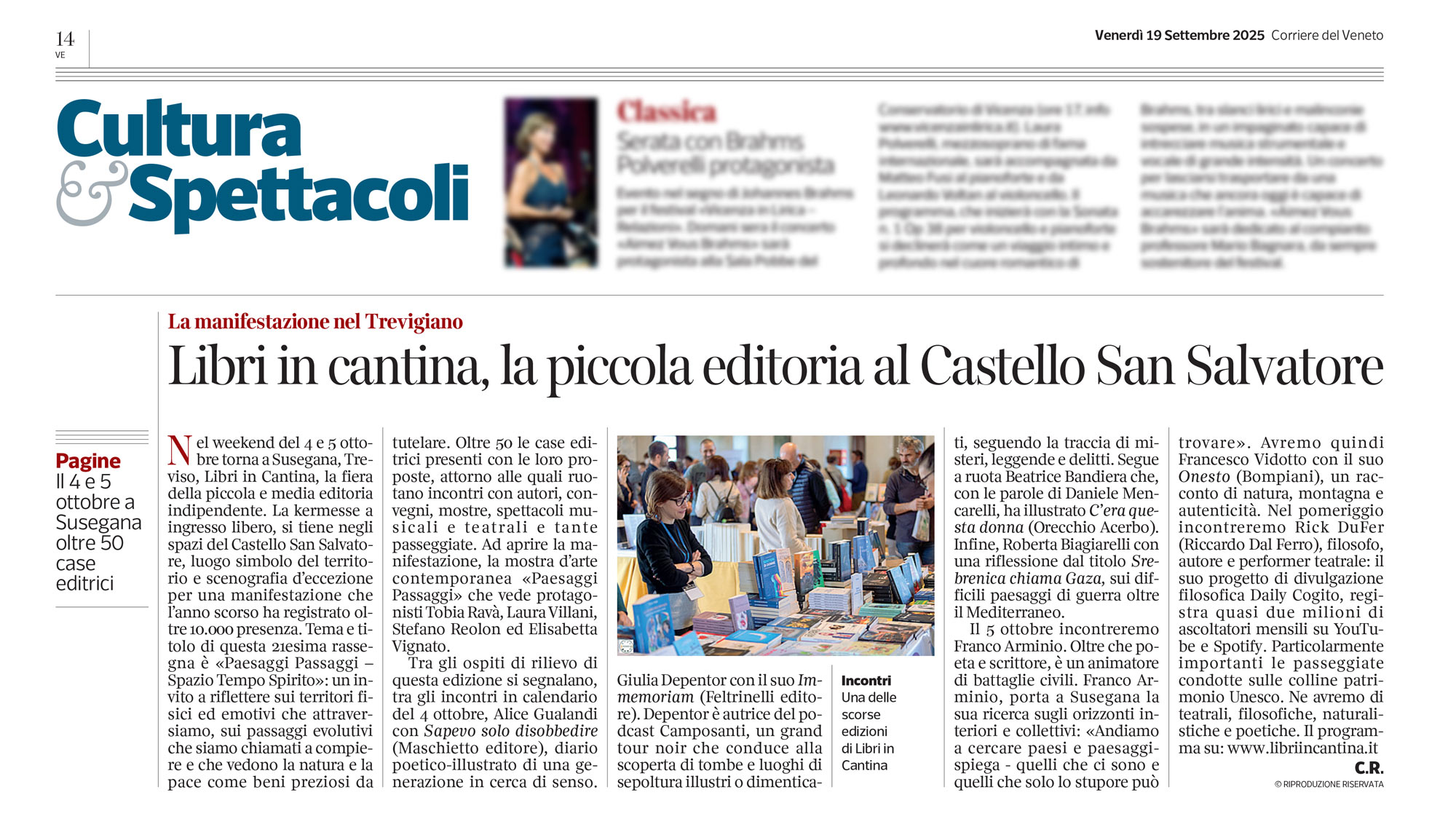 Il “Corriere del Veneto” in edicola il 19 settembre 2025 ha dedicato alla nostra manifestazione uno spazio della sezione “Cultura & Spettacoli”, citando gli ospiti presenti alla prossima edizione.